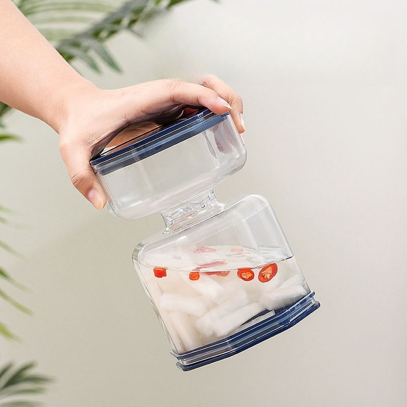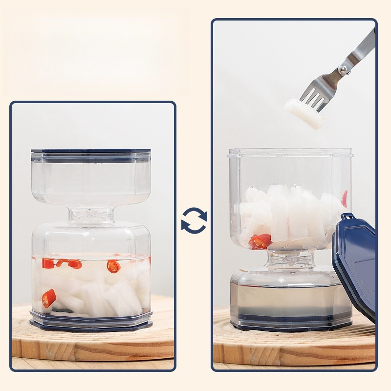 O Pote Hermético para Conservas com Separador de Líquido é ideal para quem busca praticidade e eficiência no armazenamento de alimentos. Com capacidade de 800ml, ele mantém seus alimentos frescos por mais tempo graças à sua vedação hermética, que protege contra ar e umidade. O diferencial está no separador de líquido removível, que permite armazenar sólidos e líquidos juntos sem comprometer a qualidade dos alimentos. Além disso, para retirar o alimento, basta gira-lo e ele será separado do líquido com muita facilidade. Perfeito para conservas, este pote combina funcionalidade e segurança em um único produto.